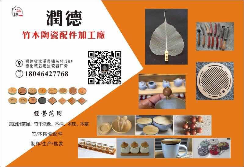 | 潤德竹木陶瓷配件加工廠專業生產制作:菩提葉茶漏、竹干泡盤、木珠、木塞、茶盤、茶道、六君子、木柄、杯墊、拉手、小五金等陶瓷器配件客服熱線:18046427768 微信:rd198955 |