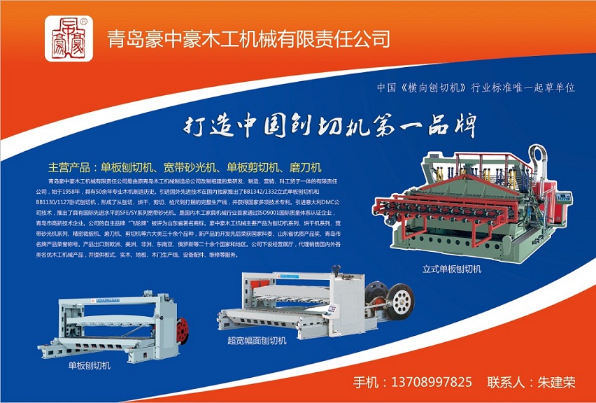 | 青島豪中豪木工機械有限公司,原青島木工機械制造總公司,始于1958年,具有50余年專業木機制造歷史。引進國外先進技術在國內獨家推出了BB1342/1332立式單板刨切機和BB1130/1127臥式刨切機,形成了從刨切、烘干、剪切、檢尺到打捆的完整生產線,并獲得國家多項技術專利。引進意大利DMC公司技術,推出了具有國際先進水平的SFE/SY系列寬帶砂光機。是國內木工家具機械行業首批通過ISO9001國際質量體系認證企業,林木機械行業首批AA級信用企業。公司產品多次榮獲中國林業機械協會“向社會推薦產品”稱號。 公司主要產品為刨切機系列、烘干機系列、寬帶砂光機系列、精密裁板機、磨刀機、剪切機等六大類三十余個品種。產品出口到歐洲、美洲、非洲、東南亞、俄羅斯等二十余個國家和地區。公司下設經營展廳,代理銷售國內外各類名優木工機械產品,并提供板式、實木、地板、木門生產線、設備配件、維修等服務。 公司致力于市場化運作,堅持“忠誠、和諧、發奮、創新”的企業精神和“全心全意為用戶服務,以服務感動市場”的企業文化,追求以當代先進的科技成果來實現產品的信息化、數控化,致力于打造中國刨切機第一品牌。信守用戶永遠是對的,奉行精益制造是為民族振興,為實現人生的價值和更好的生活,為中國木工機械行業的發展而多做貢獻。 |