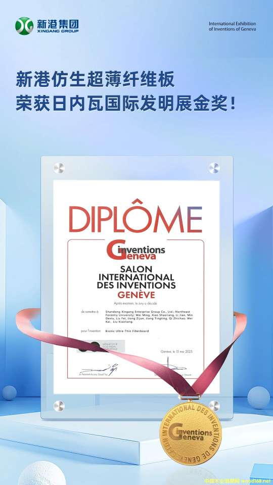 由山東新港企業(yè)集團(tuán)與東北林業(yè)大學(xué)聯(lián)合研發(fā)的“仿生超薄纖維板”(Bionic Ultra-Thin Fiberboard),經(jīng)過與全球40多個(gè)國家及地區(qū)的1000多參展項(xiàng)目的激烈角逐,最終斬獲日內(nèi)瓦國際發(fā)明展金獎(jiǎng)。新港集團(tuán)成為國內(nèi)外林業(yè)行業(yè)首個(gè)獲此殊榮的企業(yè)。